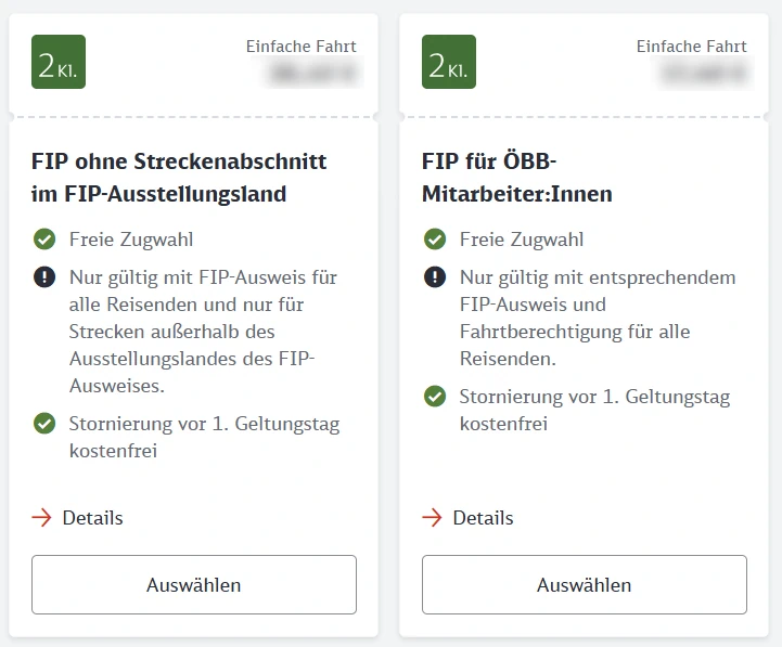 For FIP 50 Tickets, the departure and destination stations must be in different transport associations. This also applies to journeys with FIP Coupon.